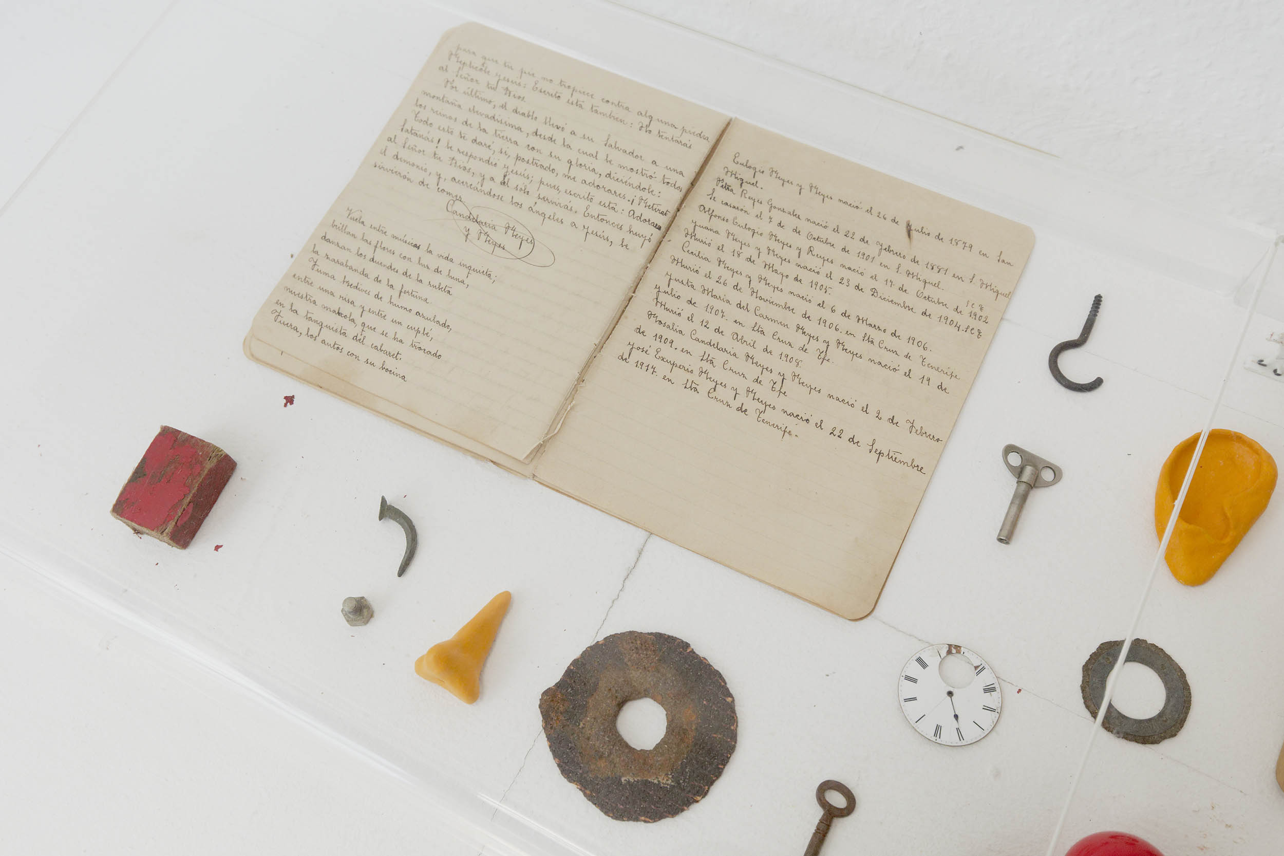 The exhibition is a tribute to Reyes’s mother and the previous generations of women in her family. A notebook belonging to her great aunt is among the objects in the display, connecting the disparate objects quite literally with handwriting of her predecessors.